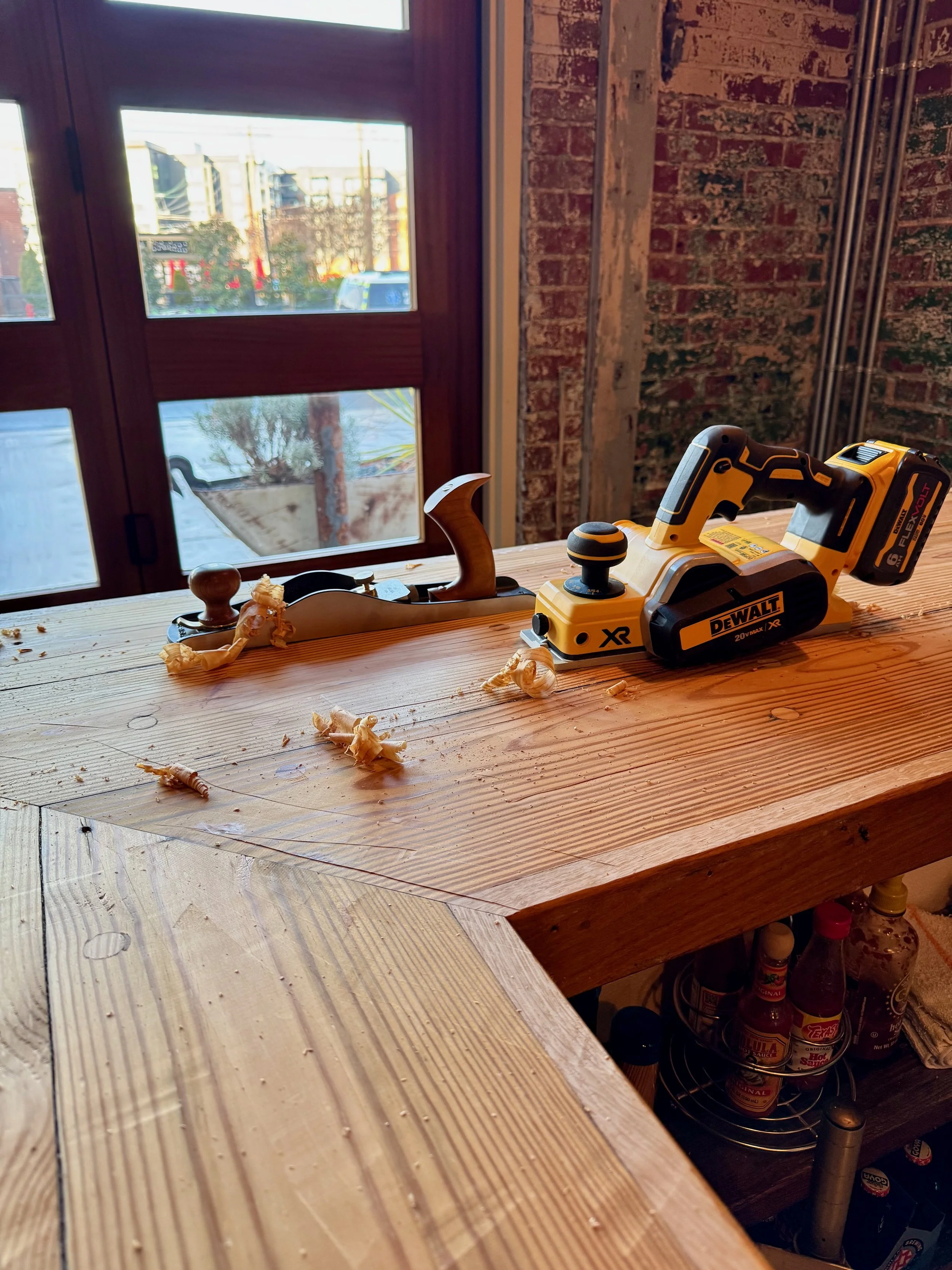 The sheer volume of the project — four small tables, one large table, two countertops, a long service counter, and the main bar — meant I had to be strategic. While my furniture builds often involve slow hand-tool work, this required a blend of traditional skill and modern efficiency.